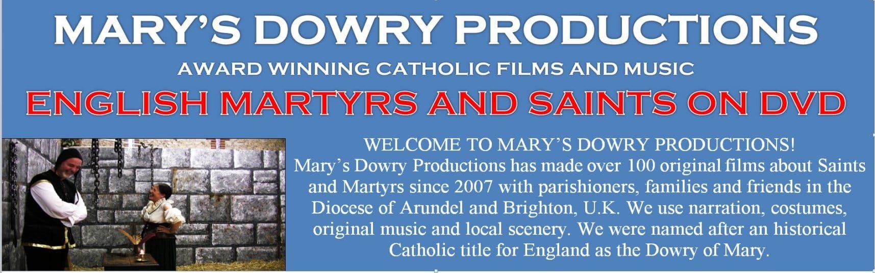 Welcome to Mary’s Dowry Productions! Mary’s Dowry Productions has made films about Saints and Martyrs since 2007 with parishioners, families and friends in the Diocese of Arundel and Brighton. We have enjoyed producing film biographies of Saints, historical figures and English Martyrs using narration, costumes, original music and local scenery. We were named after an historical Catholic title for England as the Dowry of Mary. All of our films are produced, printed and made available to purchase on Region Free DVDS worldwide in PAL and NTSC format. Because we’re asked a lot: to change the currency on this website you can choose from the drop down menu at the bottom of the page. Do enjoy browsing our online catalogue of original films to learn the stories of the Saints.